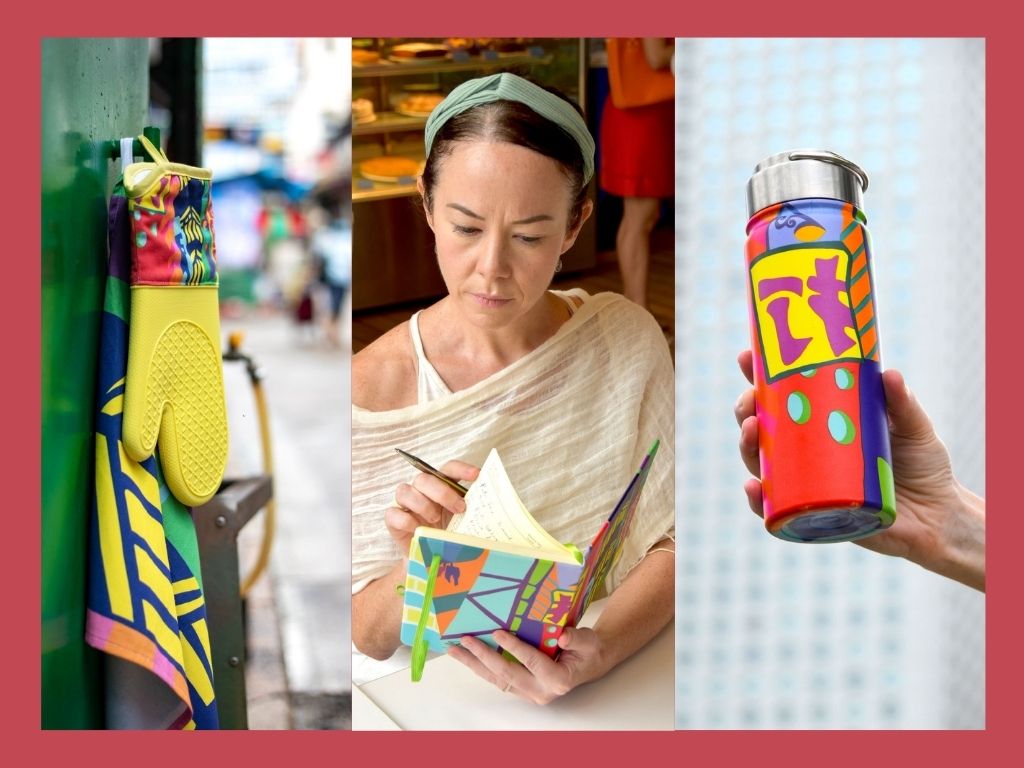 Multi-disciplinary artist and art educator, Eleanor McColl grounds her work “in place with a focus on the urban environment” and “her work draws the eye to the often-unnoticed details of the city, casting the “shadows on the wall” of the modern human condition: often solitary, hardworking and hardwearing.” Eleanor’s Chroma collection features, among other things, the water bottle, oven glove, tea towel and notebook seen here, all featuring unique designs that celebrate the city that surrounds us.