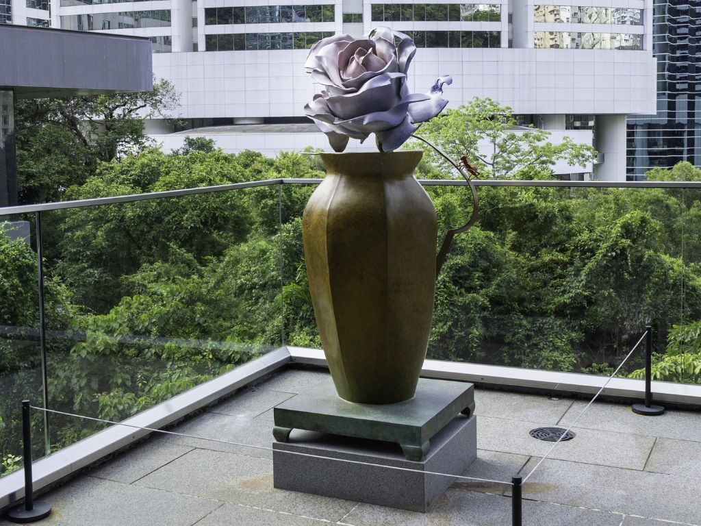 The last highlighted work is the 2023 work Floral Offering. It depicts a carved rose in a large, straight-edged vase that features a grasshopper on its handle. It is one of three works in the show that involve flowers in containers, the other two being Blue Trip and Magnificent Trip, which are both displayed in the main building’s lobby space. With Floral Offering, Lee aims to guide the viewer to contemplate “the resonance and harmonious beauty of life between impermanence and eternity”. The sculpture is perfectly placed on a platform’s edge so that it can be viewed from a variety of vantages on two different walkway levels, marking the intersection of the constructed part of the exhibition venue and its green surroundings.