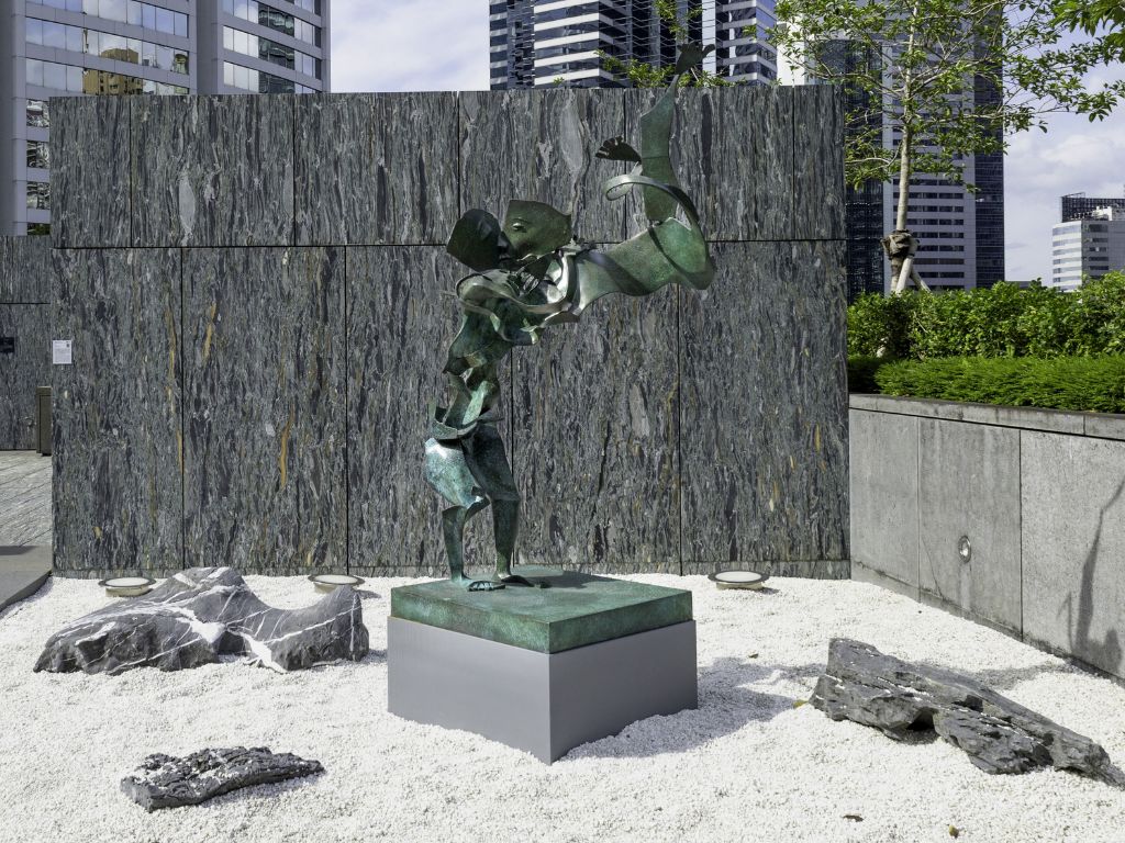 Another work featured in the rooftop garden is Lee’s 2019 sculpture, Bringing Auspicious News. This mighty figure, inspired by the Phoenix bird from Greek mythology, is waiting for “the arrival of auspicious blessings from the heavens”, symbolising the idea of transformation. Though slender in form, its structure has multiple expressions of dimension and movement, such as a hand grasping at its back or feet grounded into the work’s base. Both its partially split head and extra pair of floating feet drive home the concept of metamorphosis, appearing at some angles as two separate individuals interacting with each other and at others as a single entity.