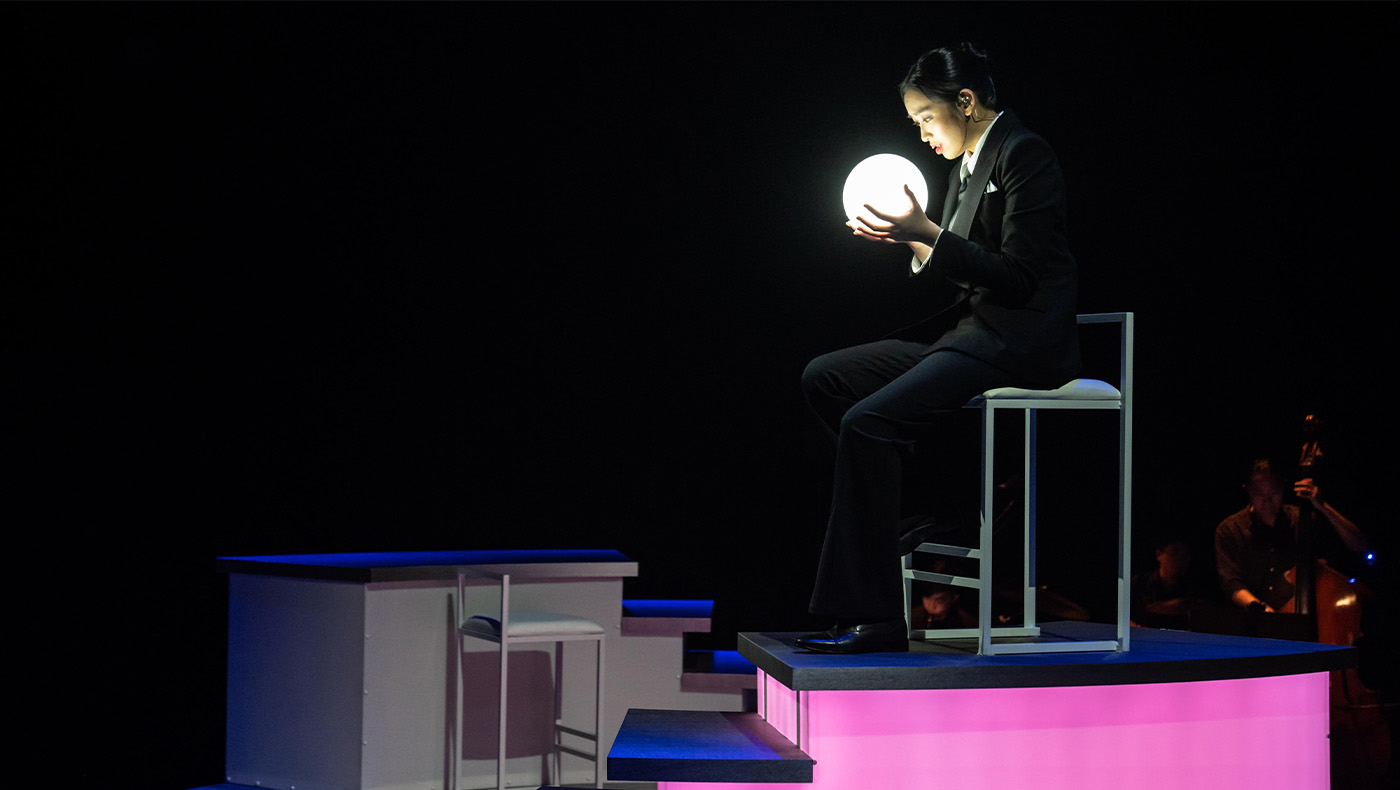 Typical of a Traverse stage arrangement, the audience sat, starting close to the performers on opposite sides. Seating rose high above the action, with the audience facing the singing-acting protagonists Yuen Siu-fai and Ashley Lin, but, also, each other as if in a kind of biblical parting of the sea. On the other ends of the stage were the jamming musicians: Alison Lau on the Nanyin Guzheng and Keith Yeung on the Yehu/Sanxian/Violin; while the jazz ensemble was led by: Daniel Chu on the keyboard, Eric Chong on guitar, Jonas Cho on saxophone, Nelson Fung on the double bass and Dean Li on the drums.