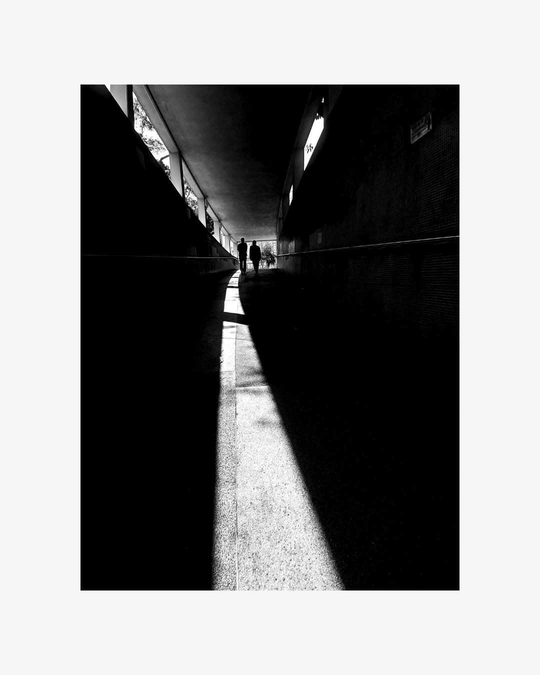 Two individuals traverse a tunnel set against a monochrome background. The scene highlights the contrast between light and shadow, creating an atmosphere filled with intrigue and mystery.