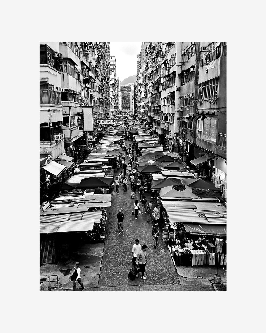 A high-angle, black-and-white view of a busy, densely populated street market in Mong Kok. Tall, closely-packed apartment buildings line the narrow street as pedestrians walk and move amid the vibrant market scene, capturing the lively, bustling essence typical of Hong Kong’s urban life.